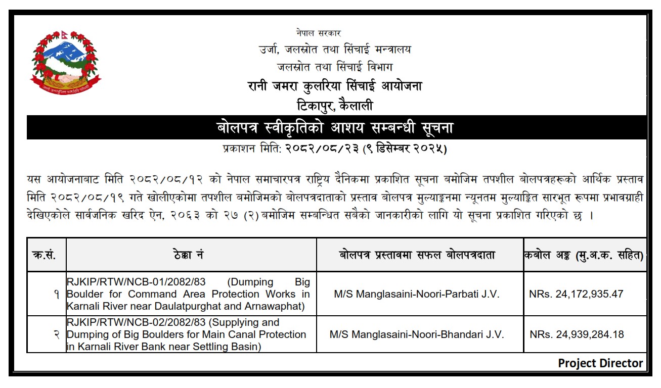 बोलपत्र स्वीकृतिको आशय सम्बन्धी सूचना